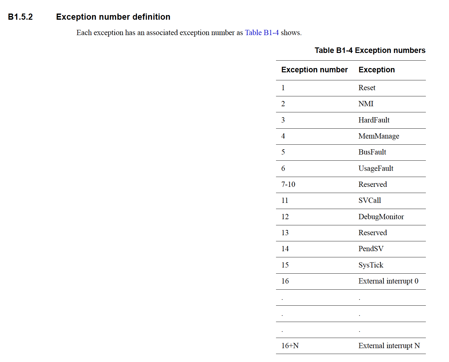NOTE: Recall that the Exception Number maps to an offset within the Vector Table. Index 0 of the Vector Table holds the reset value of the Main stack pointer. The rest of the Vector Table, starting at Index 1, holds Exception Handler pointers.