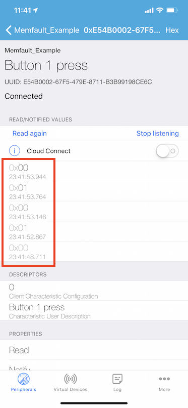 To verify that we can read the value of the Button 1 Characteristic, we can tap on “Read again”. To verify further, we can hold down Button 1 on the development board and then click “Read again”. This time it should display a value of 0x01.