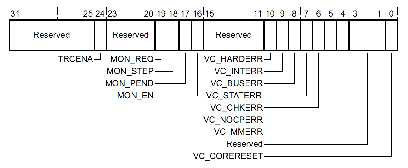 Debug Exception and Monitor Control Register (DEMCR), 0xE000EDFC