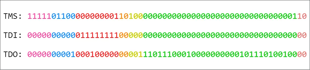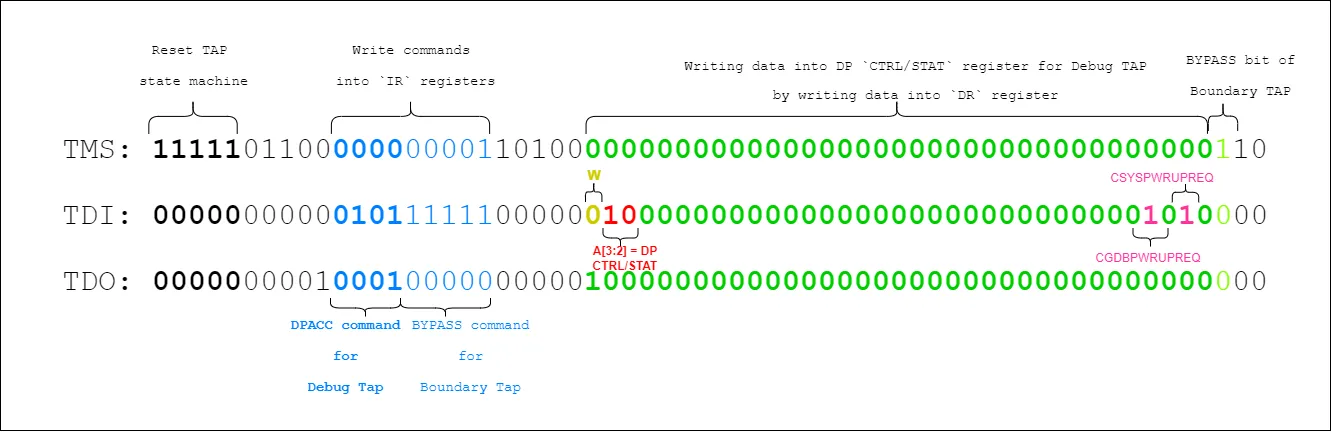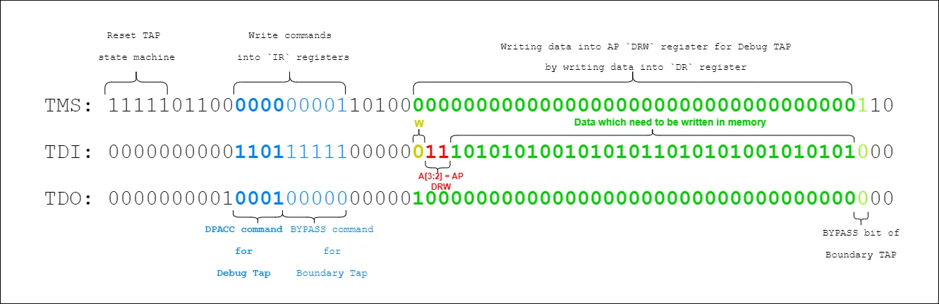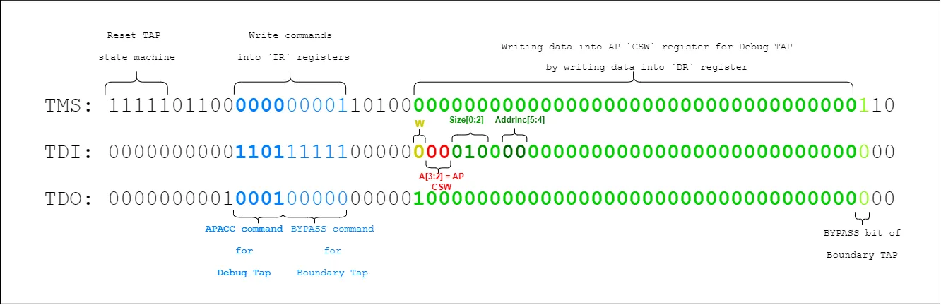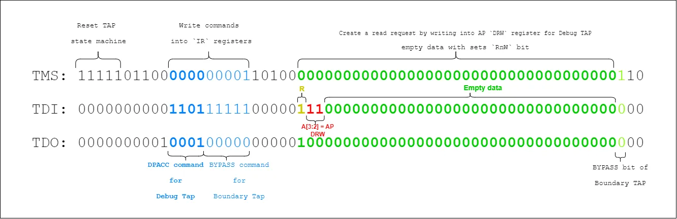 In the following two sections, I will be heavily referencing the “Practical Part” from the article A Deep Dive into the ARM Debug Access Port. This section describes the algorithm for reading/writing memory through interaction with the DAP module. Additionally, I will supplement this algorithm with a sequence of bits, illustrating how this will appear from the perspective of the JTAG protocol.