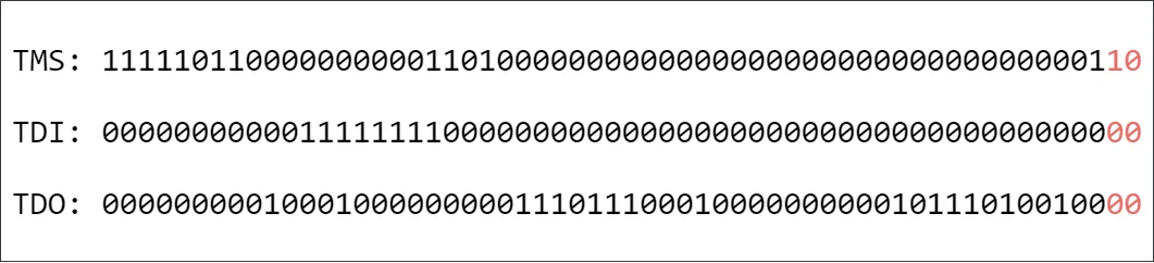 • Next, we need to load the IDCODE command code into the IR register, and to do this we put the TAP State Machine into the Shift-IR state. To do this, feed the TMS line with the sequence [0, 1, 1, 0, 0]. A sequence of blue bits is responsible for this step: