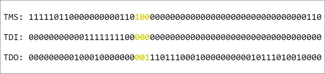 • After setting the IDCODE command in the IR register we need to read IDCODE from the DR register. To do this the first step is to go to the Shift-DR state. To do this we set the following bit sequence [1, 0, 0] on the TMS pin considering that we are in the Run Test/Idle state at the moment. The yellow bit sequence is responsible for this step: