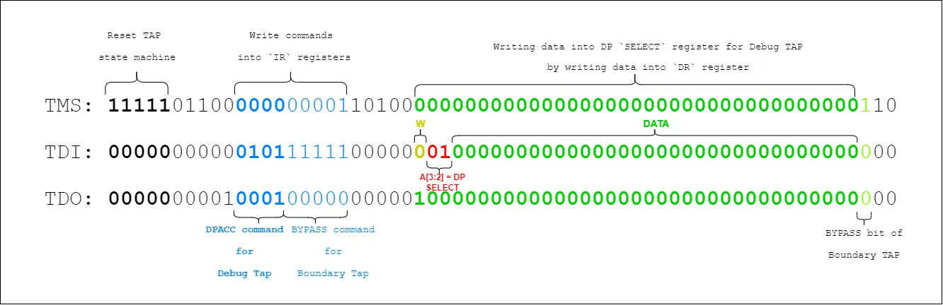 • The next step is to directly load the IDCODE command code into the CoreSight JTAG-DP TAP IR register and the BYPASS command code into the Boundary Scan TAP IR register. I think the situation for the CoreSight JTAG-DP TAP is clear, but why we load the BYPASS command into the Boundary Scan TAP should be explained. You remember that there are two TAP controllers in our JTAG chain connected in series and we can not access the CoreSight JTAG-DP TAP registers without having to write something to the Boundary Scan TAP, and the size of the IR register for Boundary Scan is 5 bits, and the DR register is 32 bits, so to write a new data to the DR register of the CoreSight JTAG-DP TAP we need to write a 32 + 32 = 64 bits sequence of bits to the JTAG circuit. This is not very convenient. The BYPASS command will help us here. When this command is in the register IR the data register of the selected TAP becomes 1 bit long. So now we need to write a sequence of 33 bits Instead of 64. The IDCODE code is 0b1110, and the BYPASS command code is 0b11111 total we need to push 9 bits: 0b011111111. The TMS input must be held at logical 0 during the 8 LSB input in order for the machine to remain in Shift-IR state. The MSB bit of the instruction is pushed in when there is an exit from this state by setting TMS to logical 1. The red bit sequence is responsible for this step: