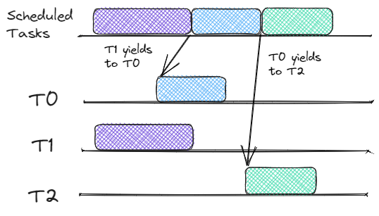 Cooperative scheduling is quite different. There is no priority, and tasks are run until they return (yield) control back to the caller. It is the responsibility of the task to be a good neighbor, and not run for too long. Compare the preemptive scheduling diagram above with the cooperative scheduling diagram below. Notice how the tasks can run to completion before switching to the next task.