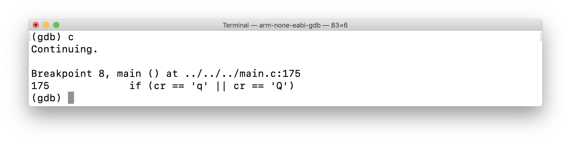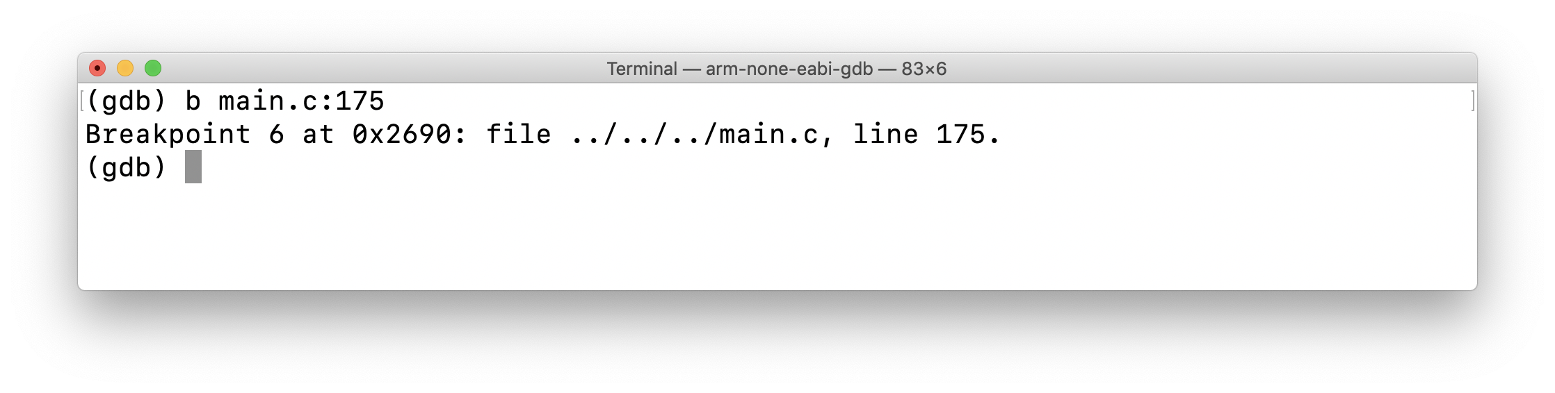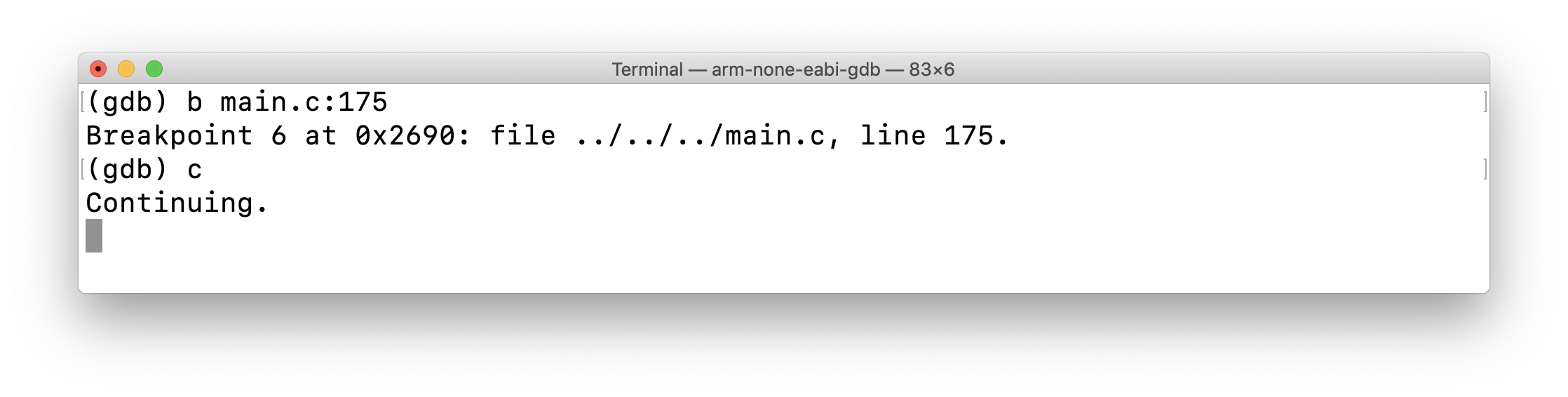 arm-none-eabi-gdbprogram included as part of the GNU Arm Embedded Toolchain we downloaded earlier.To make things easier, run the following command from the output folder where the binary images for the compiled example are located (