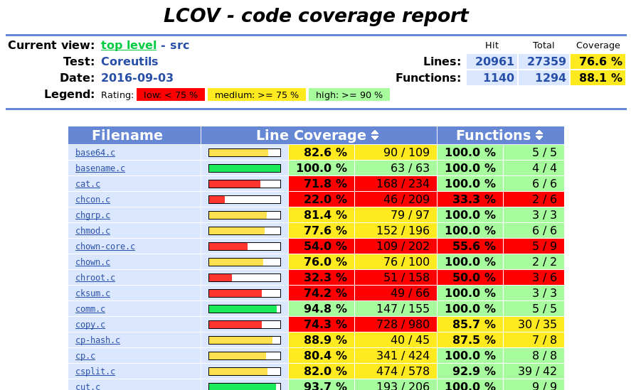 Code coverage refers to how much of a codebase is covered by tests. Below is an example output from LCOV1, a popular tool for testing code coverage.